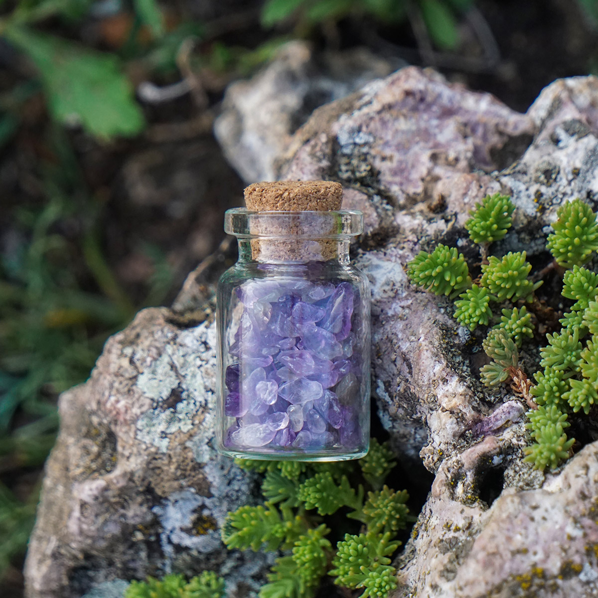 A kis palackok üvegből készültek, és fa dugókkal vannak ellátva. A kristály "chipsek" nagyszerűen használhatóak kőgyűjtemény darabjaiként, üzleti ajándéként, tanuláshoz, otthoni dekorációhoz, születésnapi ajándékként, vagy akár ékszerkészítéshez.