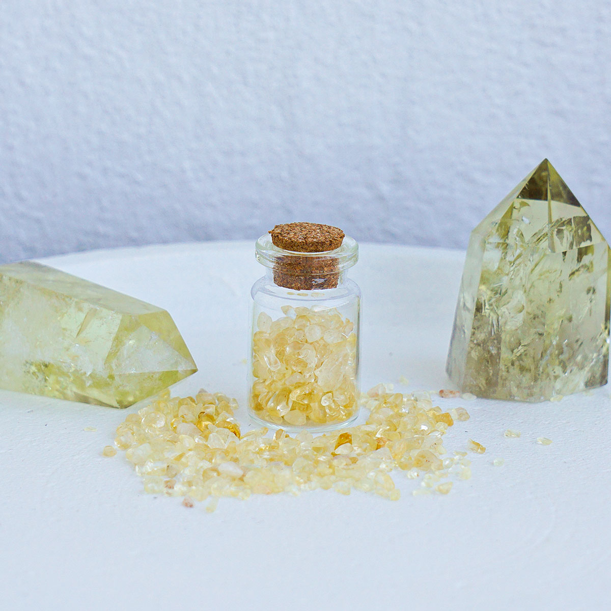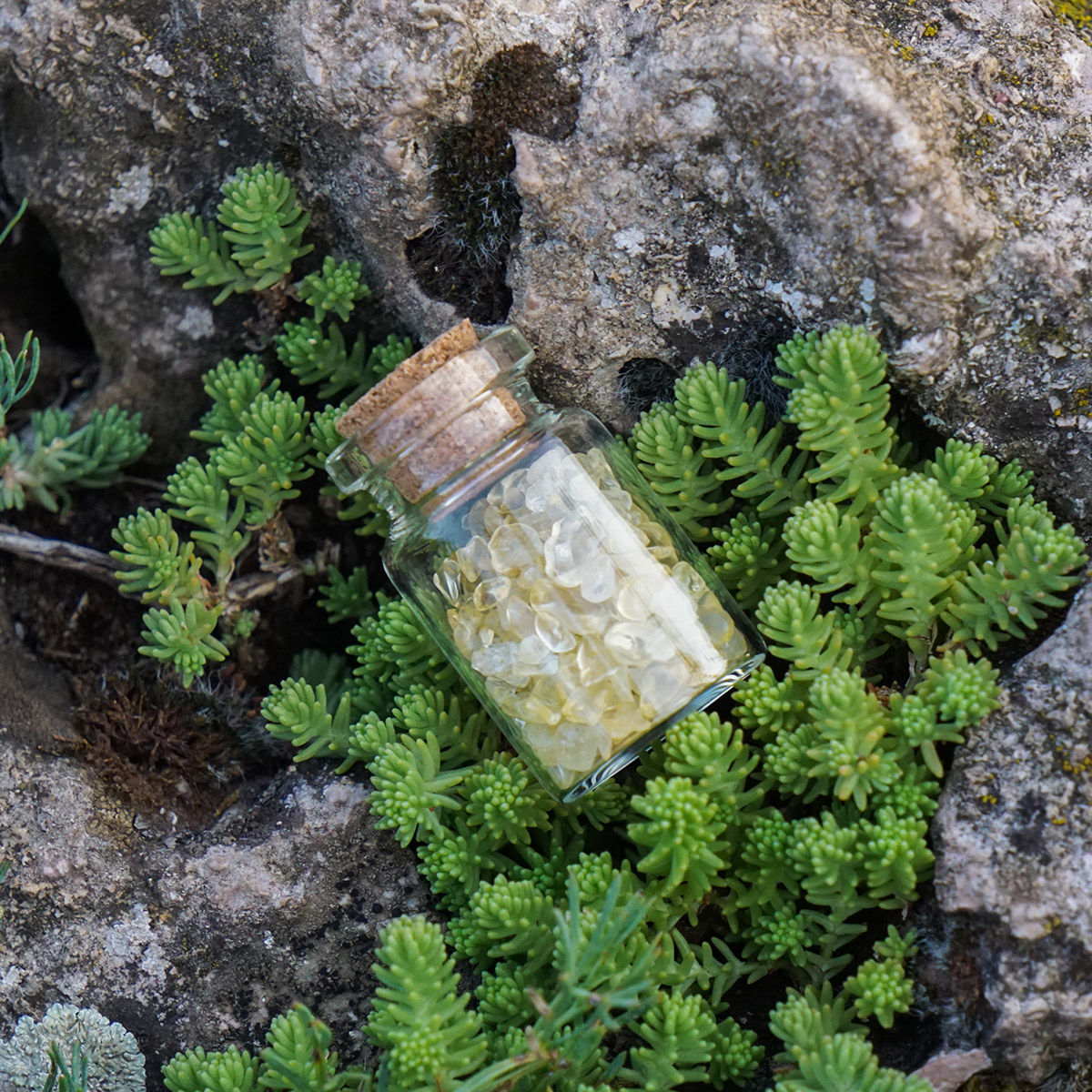 A kis palackok üvegből készültek, és fa dugókkal vannak ellátva. A kristály "chipsek" nagyszerűen használhatóak kőgyűjtemény darabjaiként, üzleti ajándéként, tanuláshoz, otthoni dekorációhoz, születésnapi ajándékként, vagy akár ékszerkészítéshez.