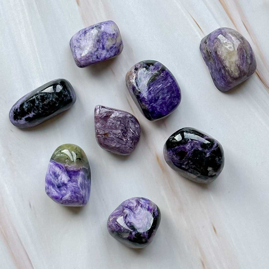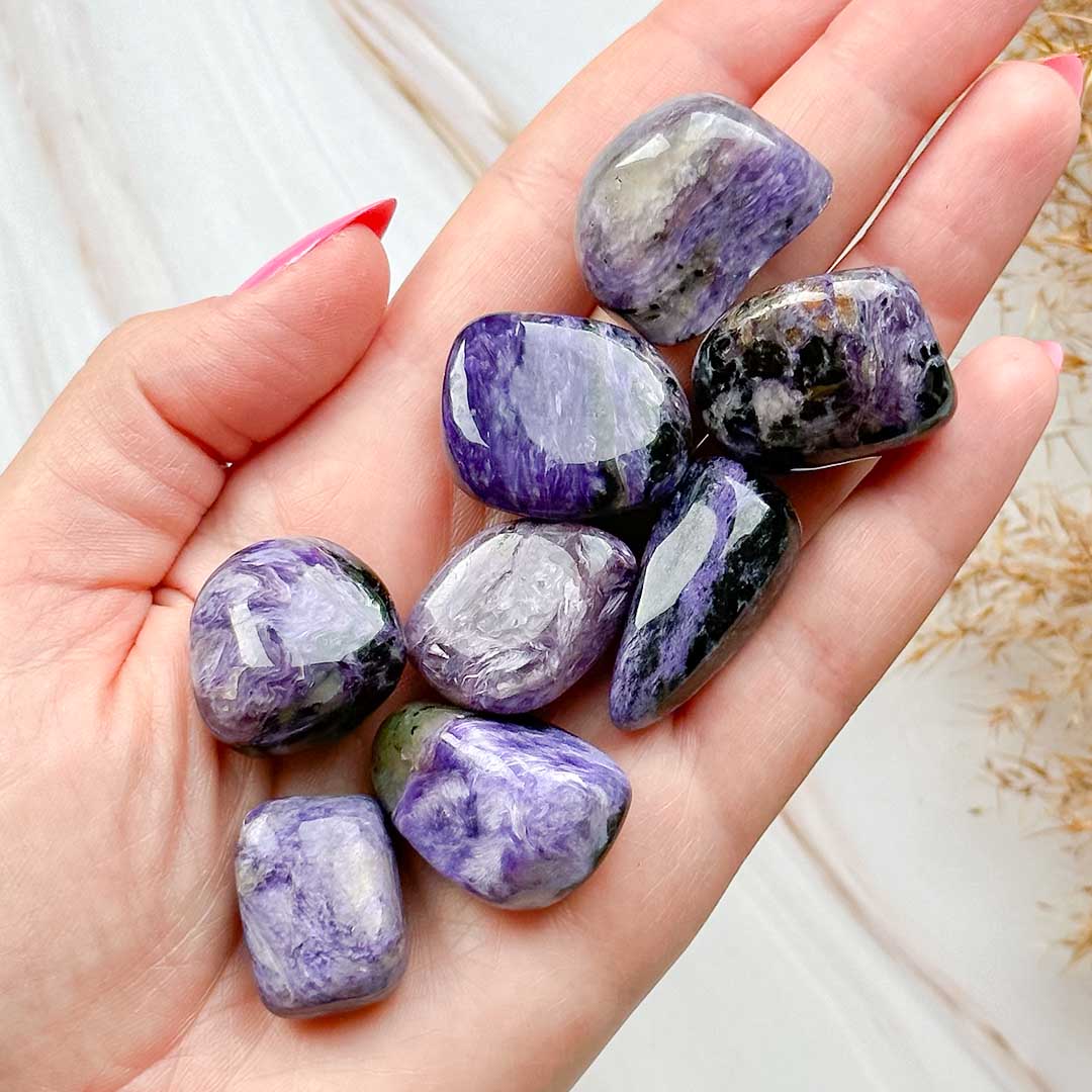 Gyönyörű csaroit marokkövek. Viszonylag új ásvány, kizárólag Szibériában, Oroszországban található meg, nevét a Csara folyóról kapta. Levendulától a mélyliláig terjedő színei gyöngyházfényű csillogásúak, intenzív színe miatt elsőre sokan mesterségesnek hiszik. Mintázata szokatlan áramló, kavargó vonalat mutat, néhol fekete egirinnel és barnás-narancssárgás tinakszittal egészül ki. Értékes és ritka ásvány!💎