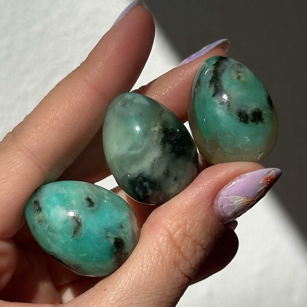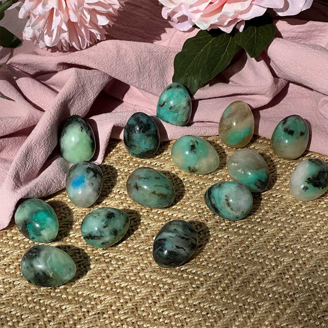 Főnix kő fantázianéven vált ismertté ez a kvarcban malachit, krizokolla és türkiz tartalmú természetes kombináció. Az egyes ásványok hatásai külön is érvényesülnek benne, de a Főnix kő érdekessége, hogy az “ultimate self respect” kő: önbizalmat, magabiztosságot, bátorságot ad, segít kikapcsolni a félelmeket hogy végre korlátok nélkül koncentrálhass a céljaidra. Segíti a személyes fejlődést, a kibontakozást. Szuper cuki tojás formákat hoztunk belőlük, kínai lelőhelyről érkeztek.