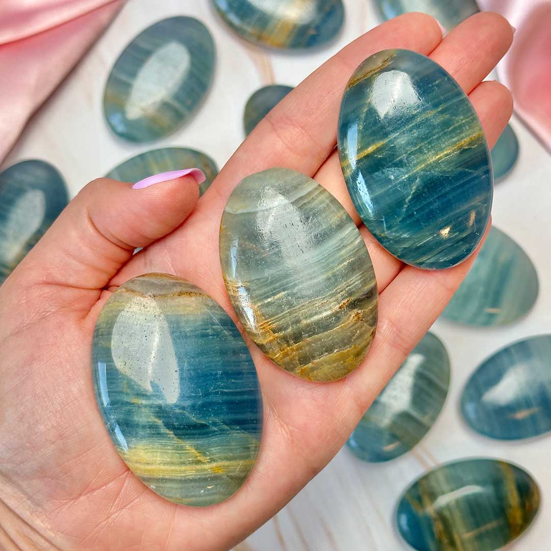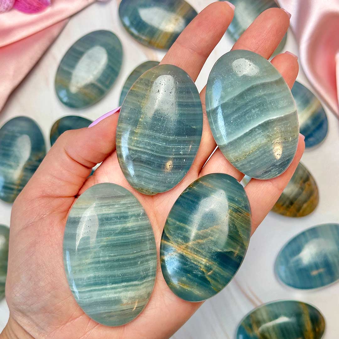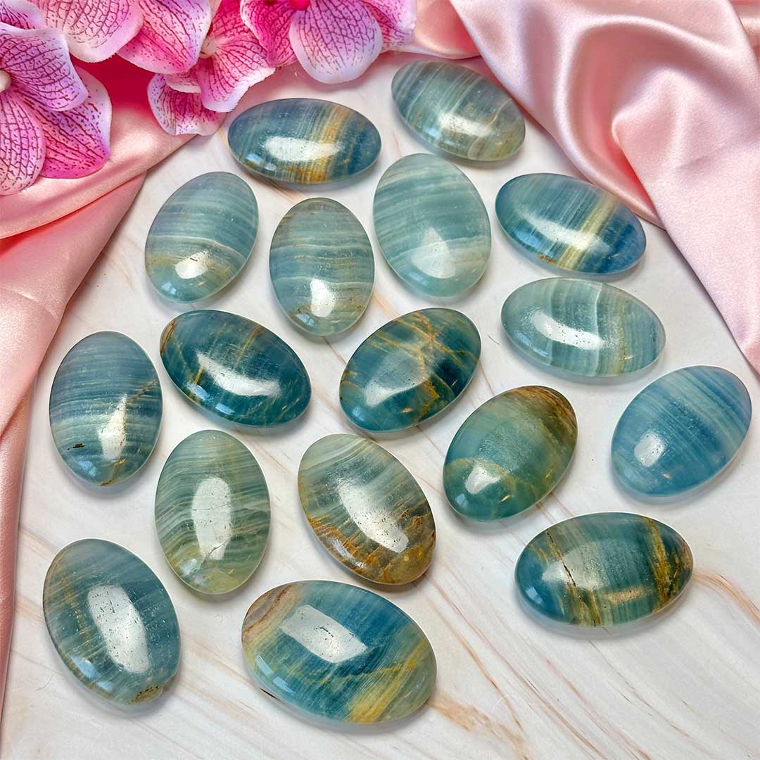 Ez a különleges, jellegzetes kék színű kő egy kalcium-karbonátból álló ásvány, mely a “Lemurian Aquatine” Kalcit nevet viseli, sokszor (tévesen) kék ónixként emlegetik. Csak Argentínában található meg, így ez egy ritkább kristály, mely a kék különböző árnyalataiban létezik teljesen természetes formában! Ez a sötétkék típus a legmagasabb minőség, ritkán találni belőle, repedések viszont így is előfordulhatnak felületén! Kb. 5,5 x 4 cm-es darabok.