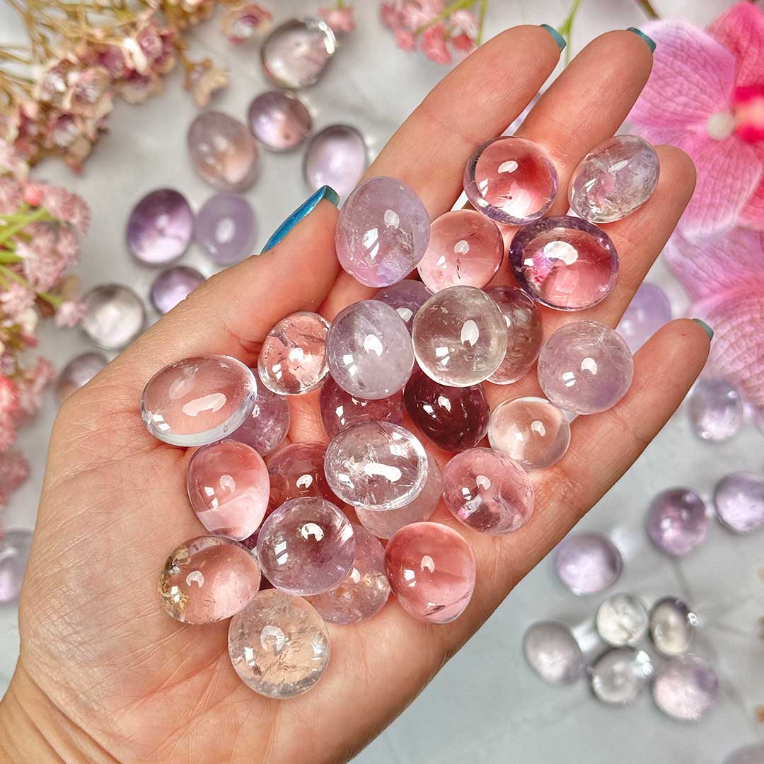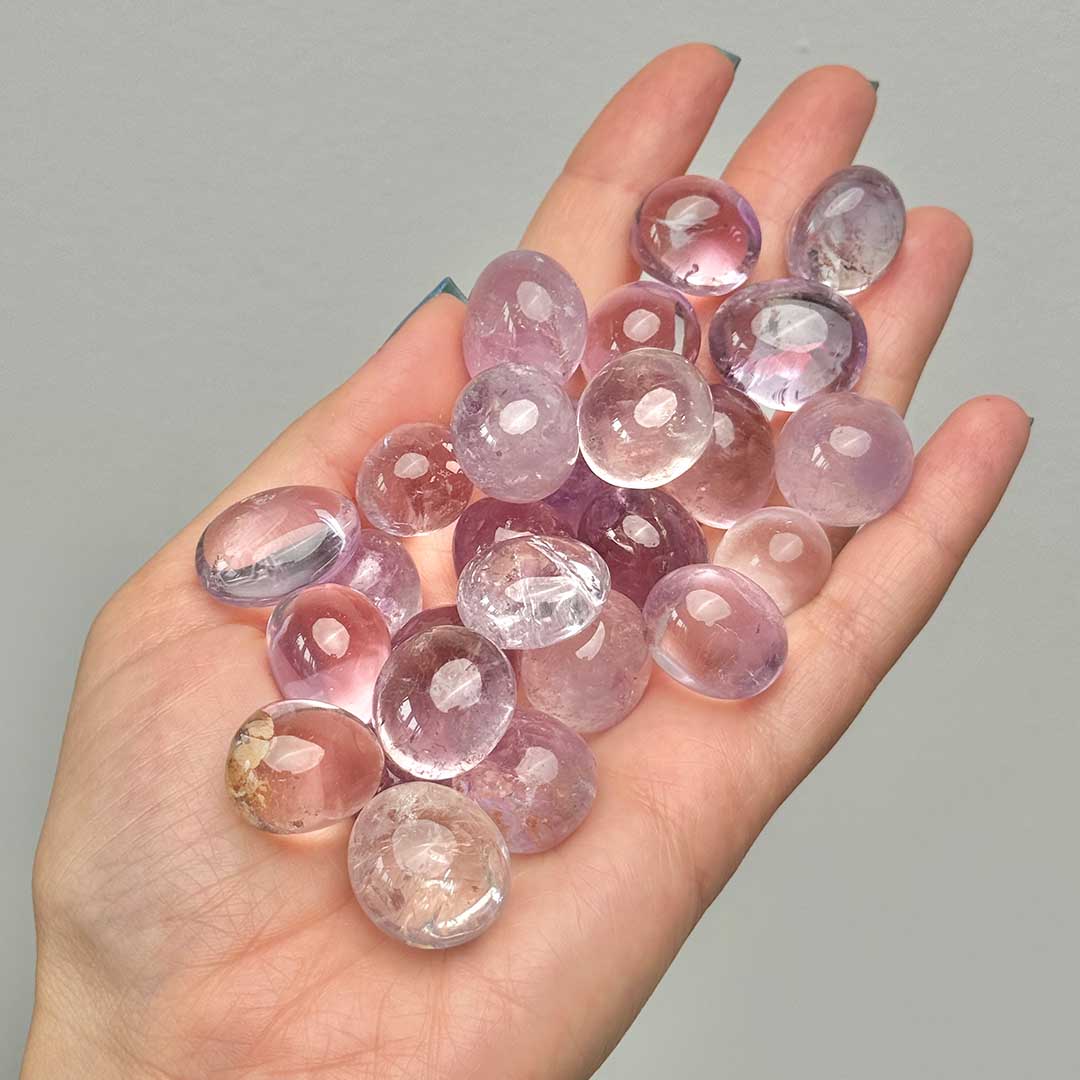 Magas minőségű ametiszt marokkövek, melyek a kivételesen pasztelles beütésű levendula ametiszt típusból kerültek csiszolásra! Halvány, álom-szerű színük és gyönyörű átlátszóságuk lenyűgözővé teszi őket, nagyon tiszta darabok.