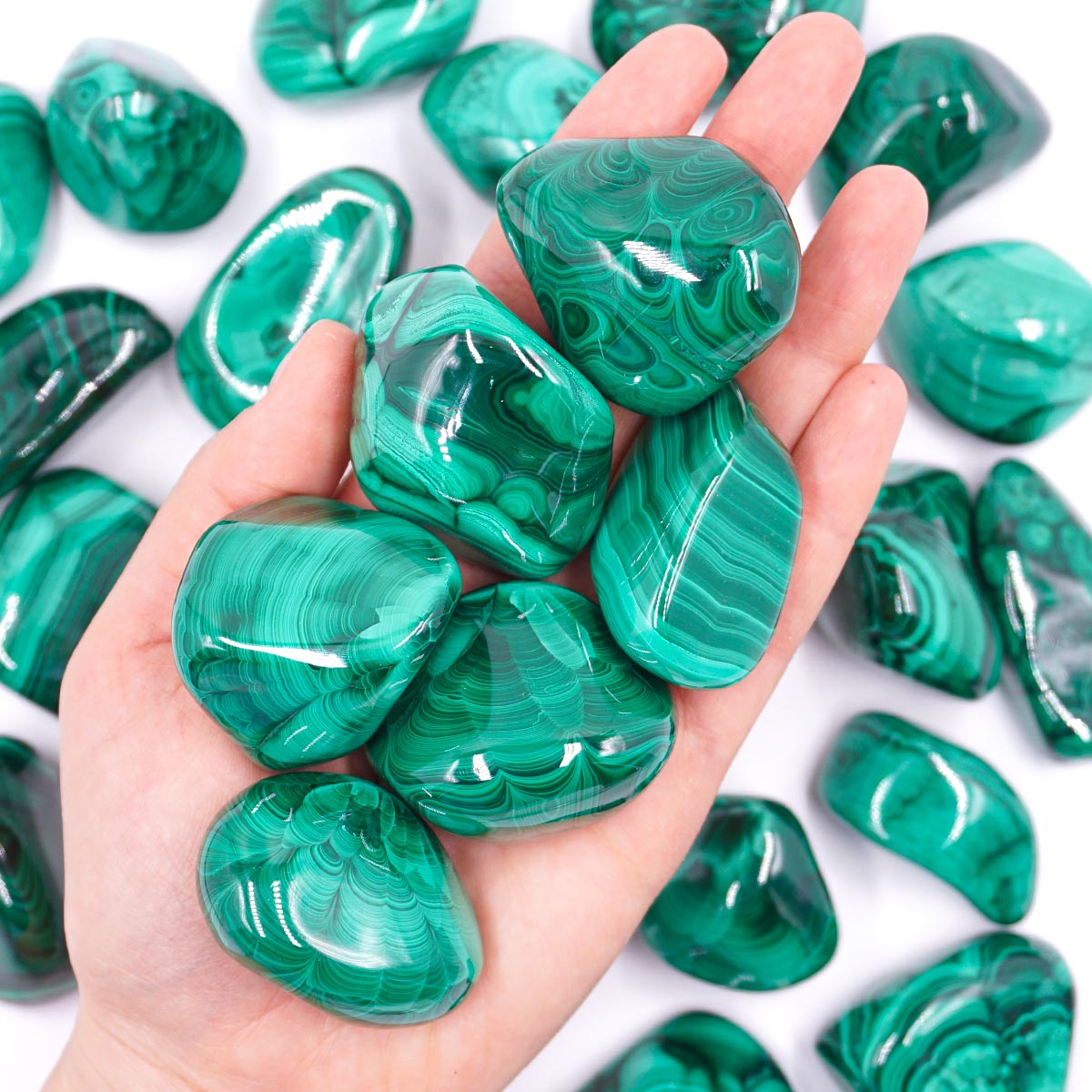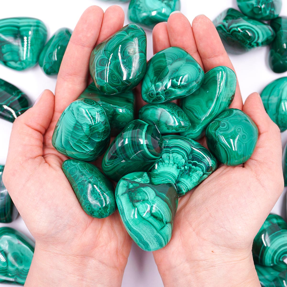 Jelenleg egy nagyobb, nagyon szép darabunk van, kicsit nagyobb mint a fotón láthatóak. Különleges, magas minőségű, kongói Malachit ásvány marokkő. Gyönyörű mélyzöld színűek. Mérete kb. 4 cm x 3,2 cm (lásd a fotókon). A választott köveket véletlenszerűen választjuk ki. A méretek, formák és színek változnak!