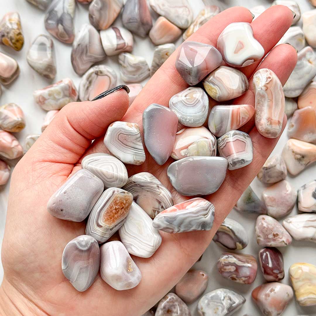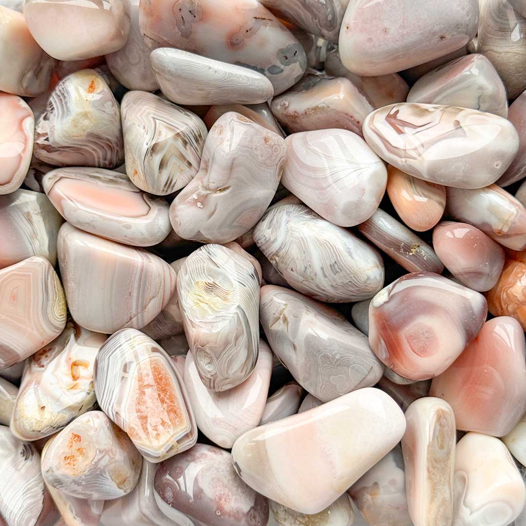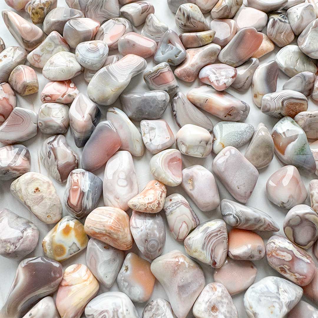 Mesés Pink Botswana Achát marokkövek, melyek pasztelles, rózsaszínes-lilás színvilágban tündökölnek. Sok darabon látható mutató csíkozás is, de az összes nagyon kellemes, pasztelles áramló mintázatú.