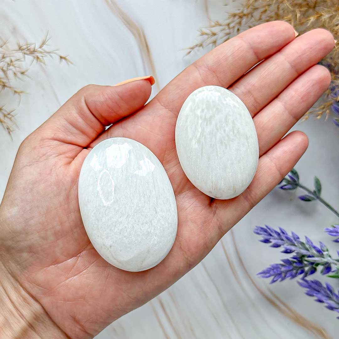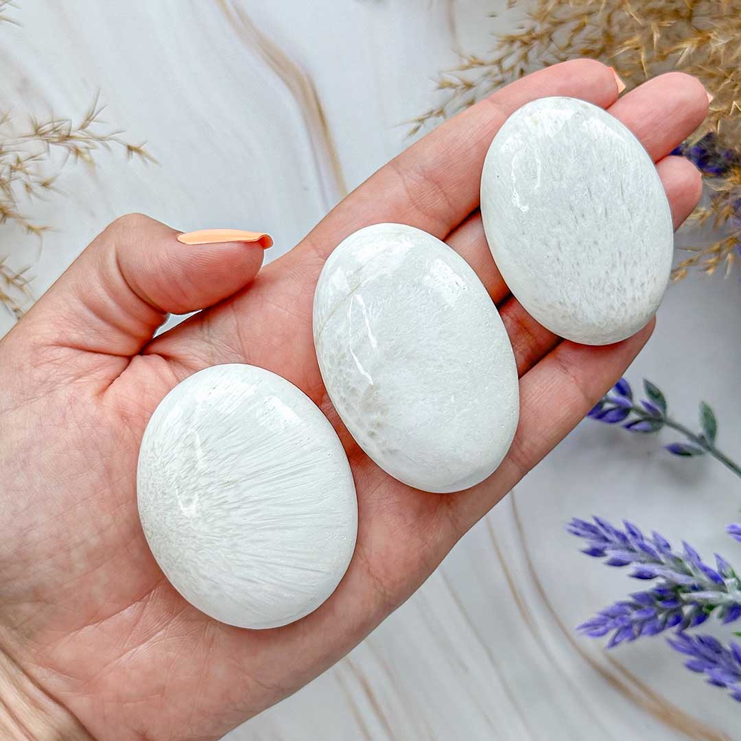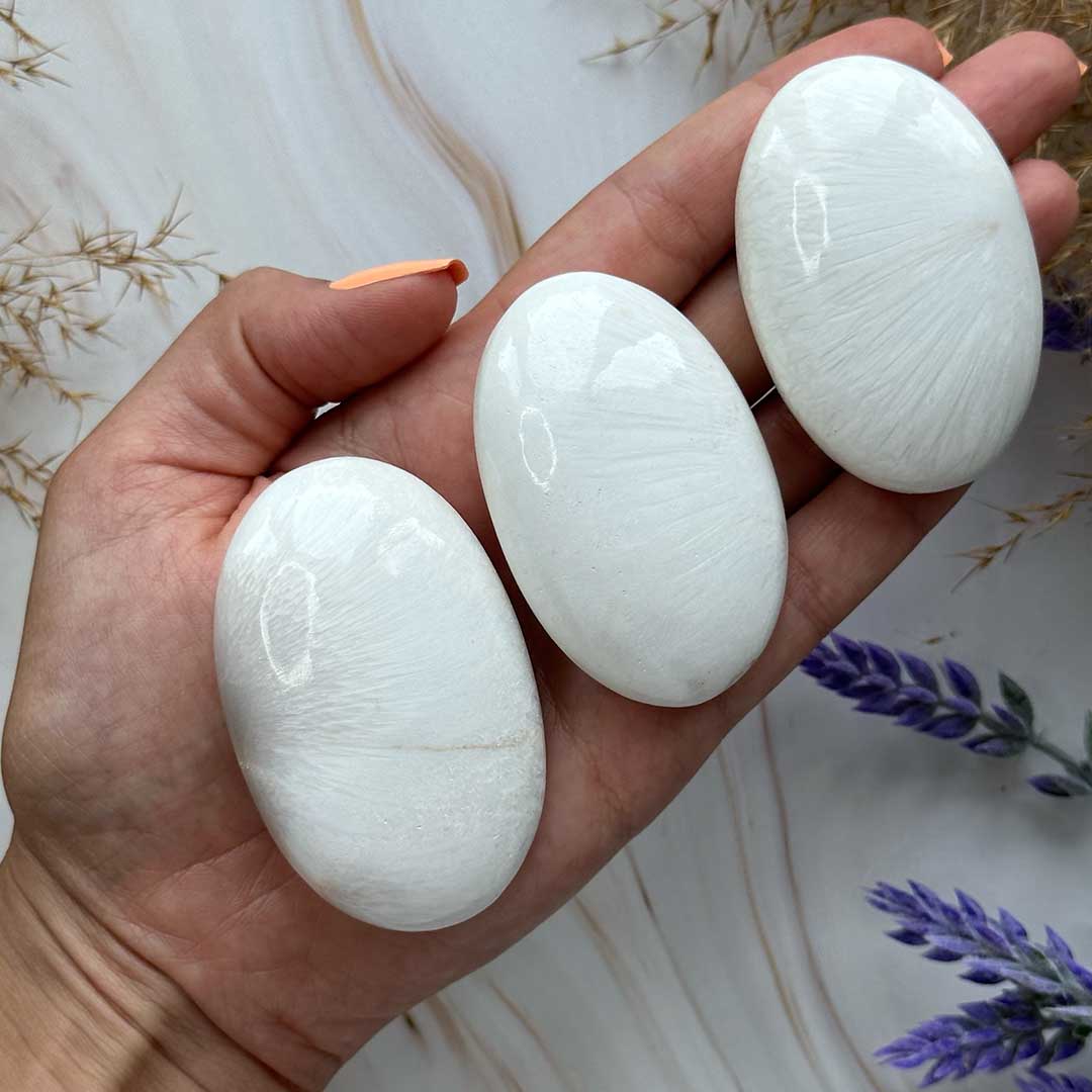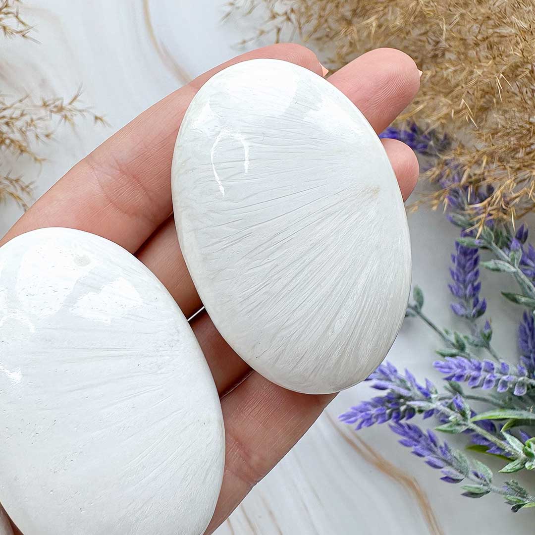 Különlegesség Indiából!🤍 Csiszolt Scolecite (szkolecit) ásványok, eredeti megjelenésük vékony tűs szálakból álló kristályformáció, melyet ha magas minőségben találnak, ékszernek is csiszolnak - marokkő méretként ritkán fellelhető, ezeknek jellegzetessége, hogy az eredeti tűs szerkezet csiszolás után is megfigyelhető, gyönyörű, gyöngyházfény jellegű fényjátékot hozván létre!😍🙌🏻✨A szkolecit a békesség és a kapcsolat köve. Harmadik Szem és a Korona csakrával rezonál hogy mély, belső békét hozzon.💆🏼♀️ A szkolecittel való meditáció a múltból és a jövőből származó információkat hozhat, hogy segítsen nekünk jelen fizikai létezésünkben.🙌🏻✨