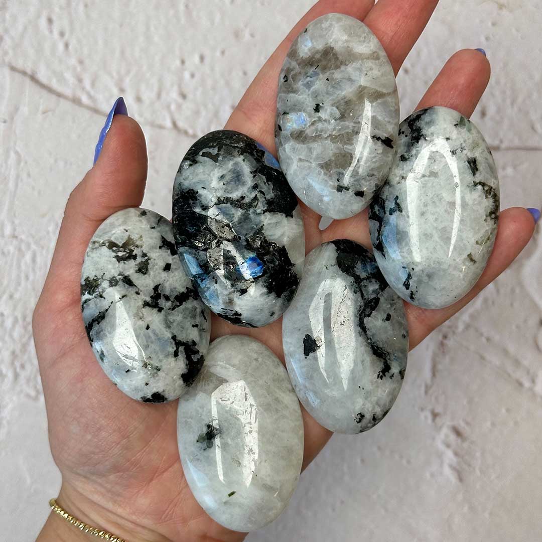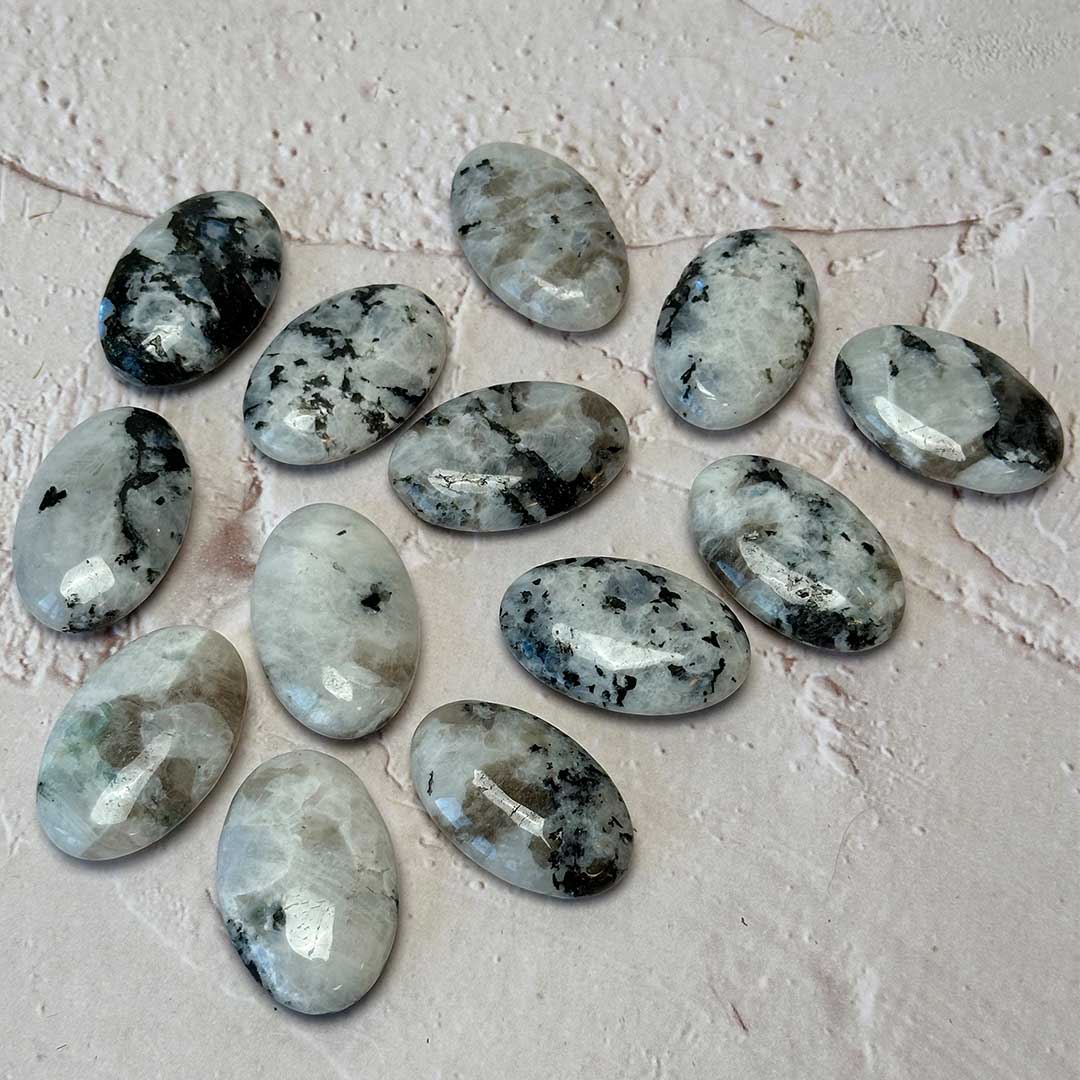 A szivárvány holdkő a holdkő fehér alapon fekete pettyezett típusa, melyen gyakran fordul elő kékes fénylő flash is. Minden marokkő laposabb, fény nem garantált!