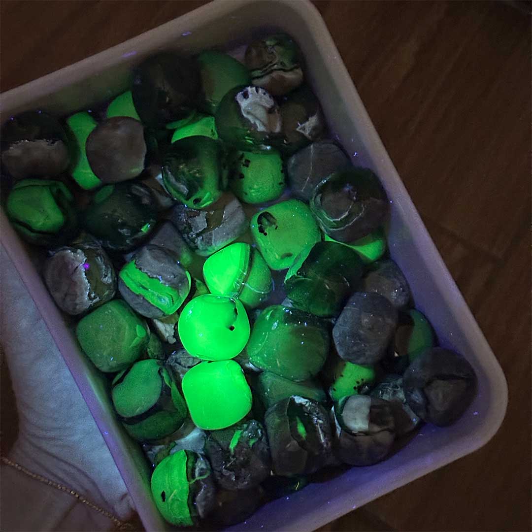 Igazi ritkaság - Vulkáni achát marokkövek! Ez a teljesen természetes achát típus UV fény alatt a szürkés részeknél egy fluoreszkáló zöld színvilágot fed fel, mely zölden dereng az ásványban. Ez egy 100%-ban természetes jelenség, mely annak köszönhető, hogy az ásványkombinációban urán tartalmú kalcedon van jelen - több urán, erősebb zöld fény. Ezt az achát típust Vulkanikus achátnak is nevezik, mivel az achát vulkanikus kőzetekben előforduló erek és hasadékok kitöltésével keletkezett. Nem minden Vulkanikus achát UV reaktív viszont!