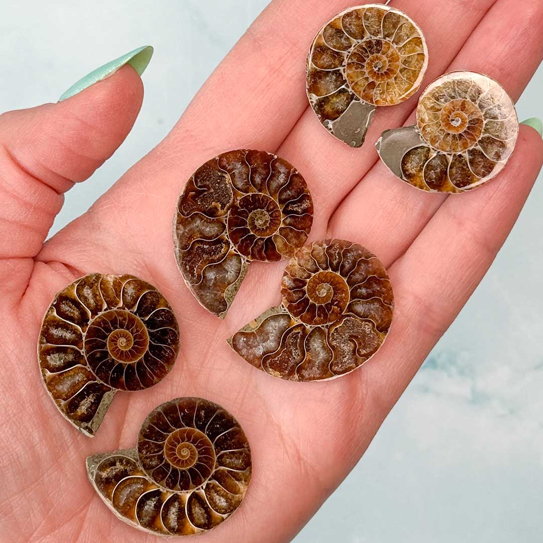 Különleges, ősi ammoniteszek, melyek középen elvágásra kerültek így felfedvén a valaha volt ősi élőlény különleges belső kamrás házának szerkezetét. Gyönyörű képződmények, melyekben a kristályosodás folyamán néhol pirit is megjelent, ez is felfedezhető egy-egy darabon.