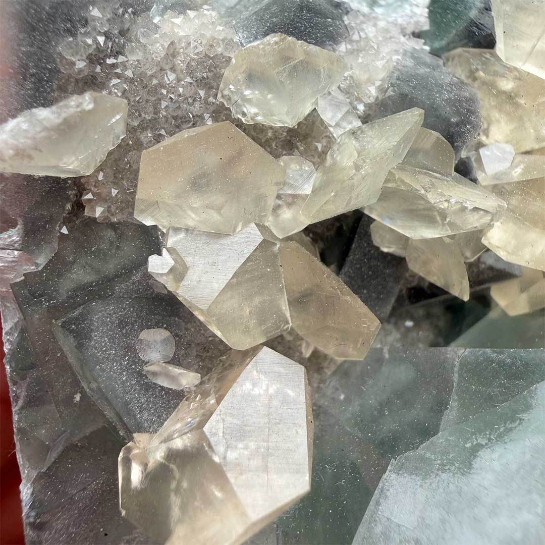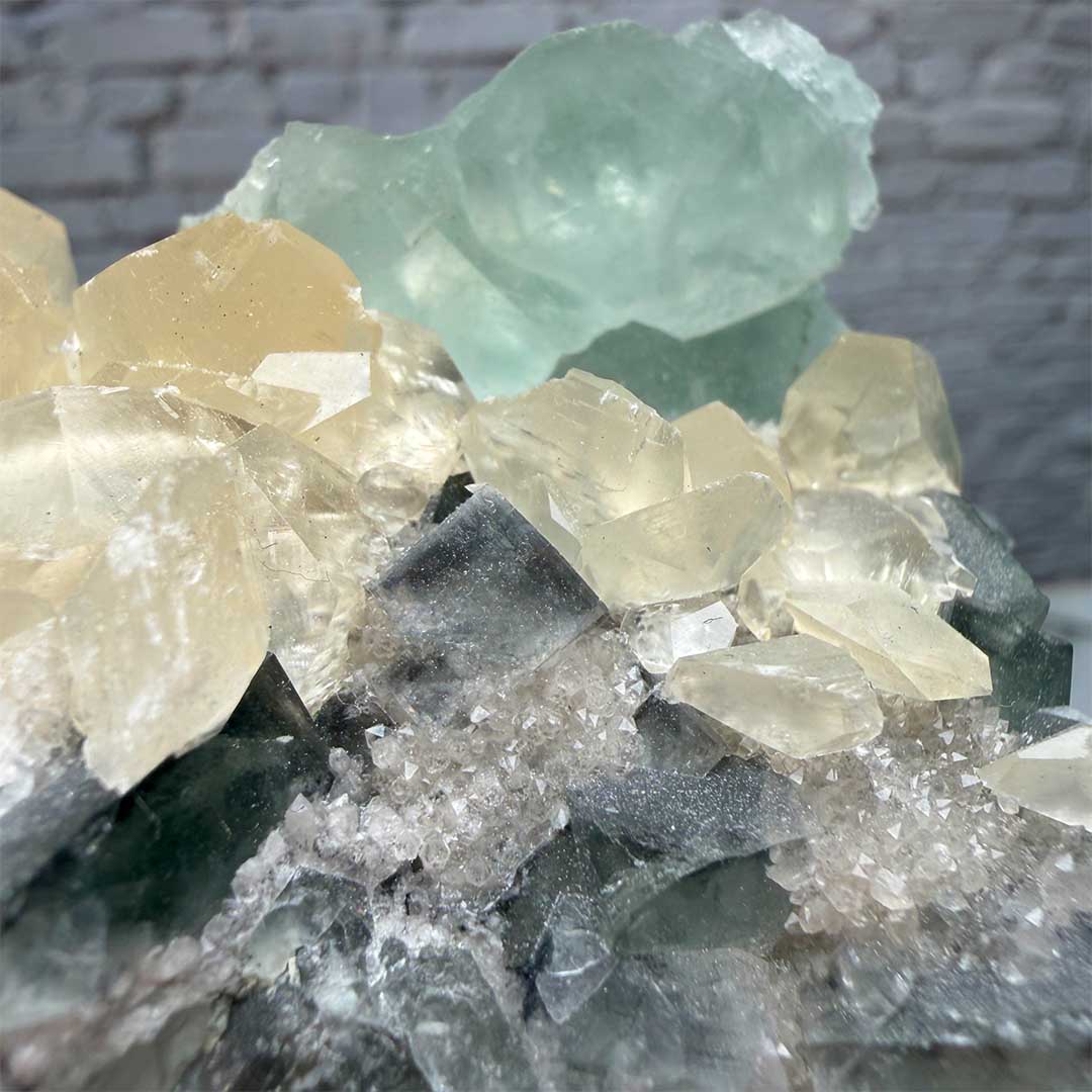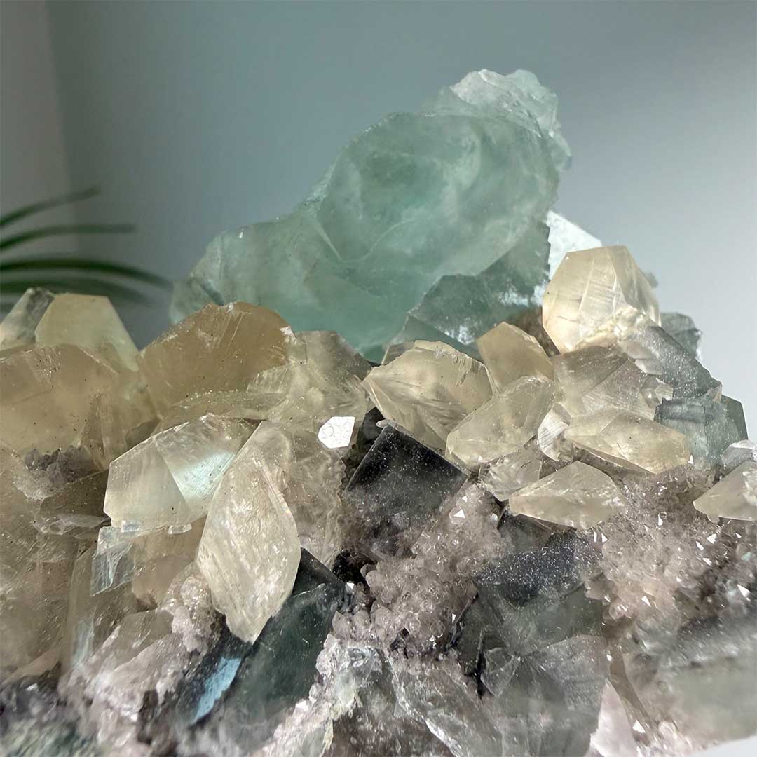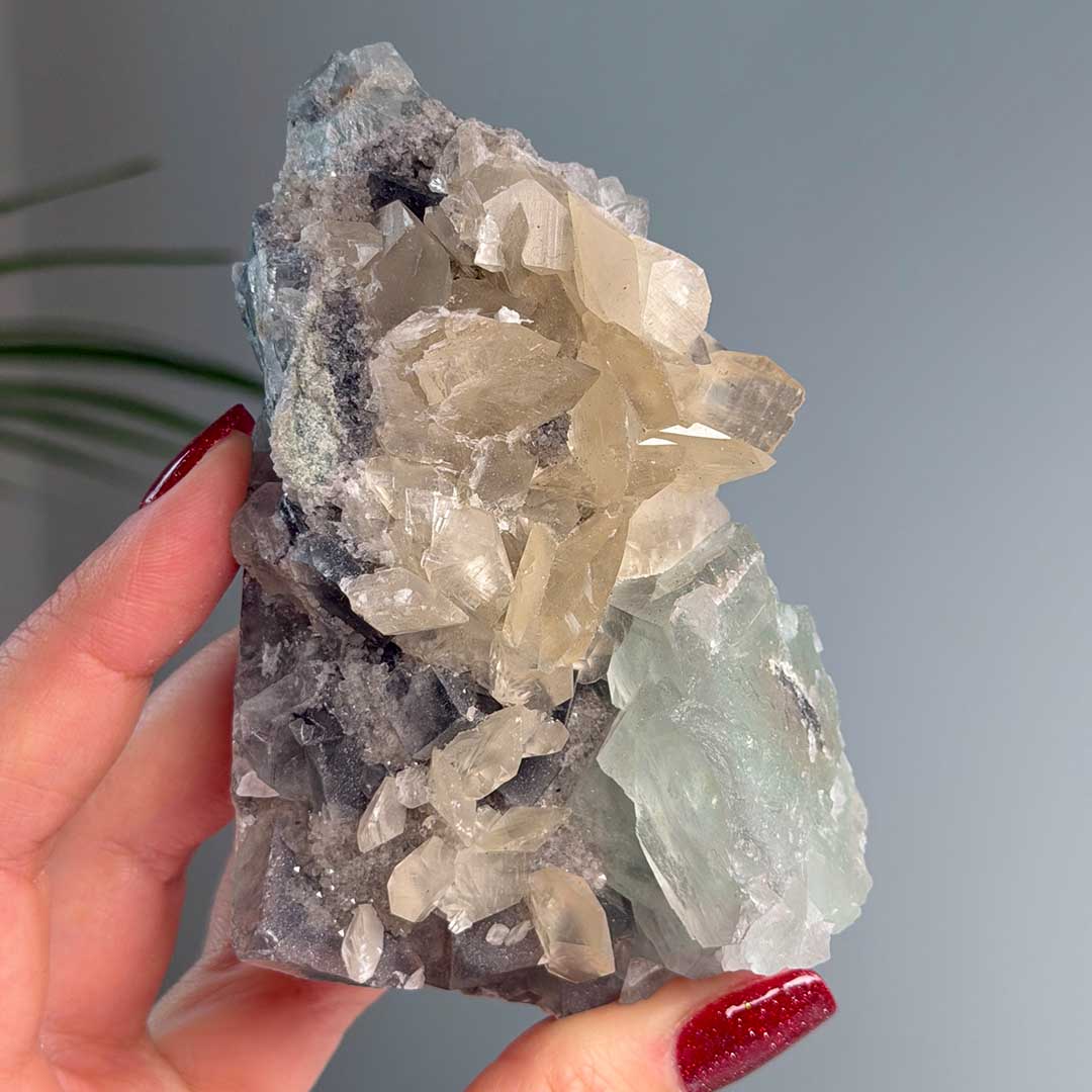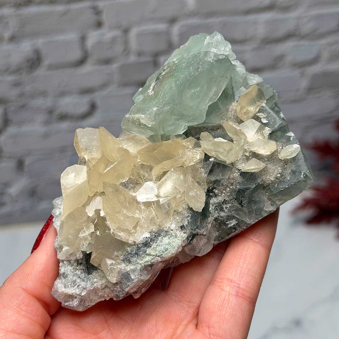 A Fluorit és a Kalcit telep egyedi formája és színkombinációja kiemelkedik a gyűjteményedben vagy dekorációdban. Ez a különleges páros segíti a fókuszálást, tiszta gondolkodást és a mentális egyensúly megőrzését, miközben nyugtató energiát sugároz. A Fluorit tiszta, élénk színű kristályai szemet gyönyörködtetőek, a hozzá társuló kalcit áttetsző mintázatai pedig még különlegesebbé teszik a darabot. A két ásvány együttese kiemeli a természetes formák játékosságát és a kristály egyedi karakterét.