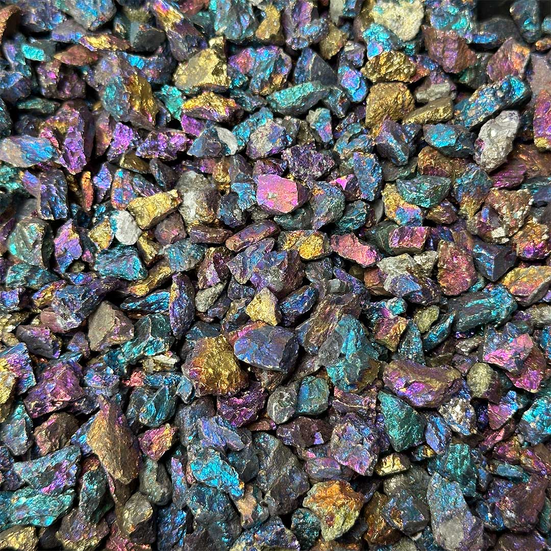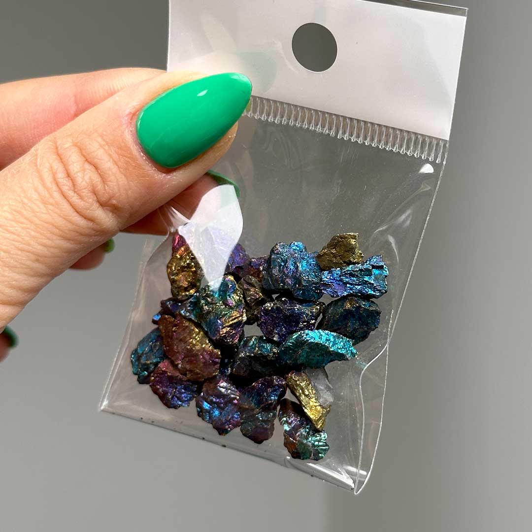 Fényes, kék-lila-zöld színekben irizáló miniatűr nyersek kalkopirit ásványból. Teljesen természetes, a színe semmilyen módon nem módosított. A képen látható kis tasakban érkezik 20 gramm a kalkopirit minikből!
