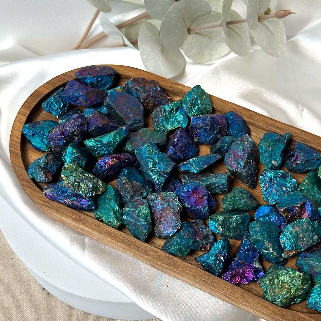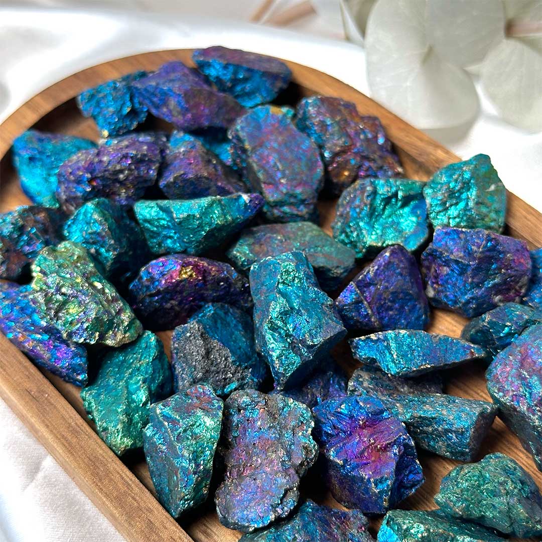 Ez a különleges kalkopirit gyönyörű, természetes kékes, lilás és zöldes fényekben játszik, melyek semmilyen módon nincsenek kezelve vagy festve. A felszíni oxidációs folyamatok következtében a levegővel való érintkezés hatására megváltozik a színe, így a fényes aranysárgából kékes, lilás vagy zöldes árnyalatok jelenhetnek meg.