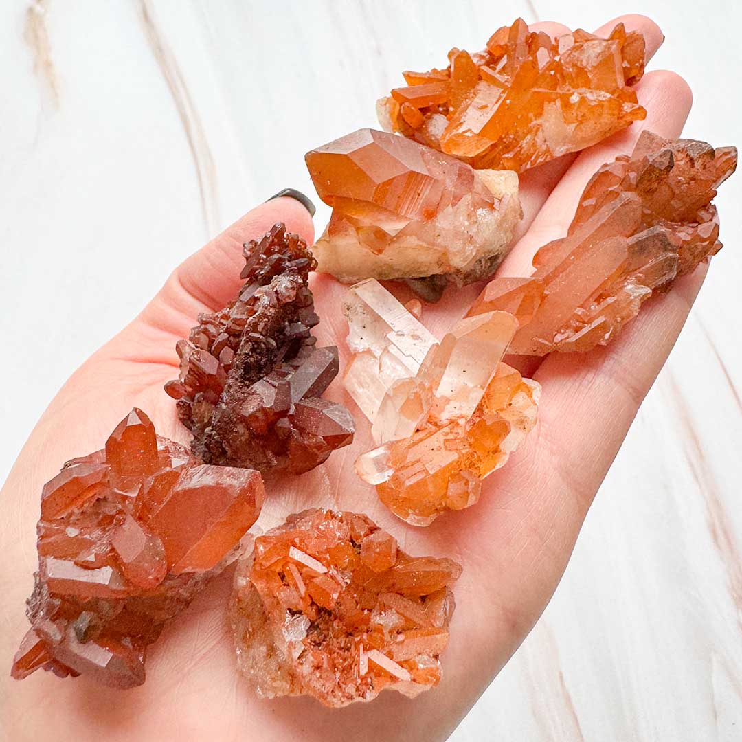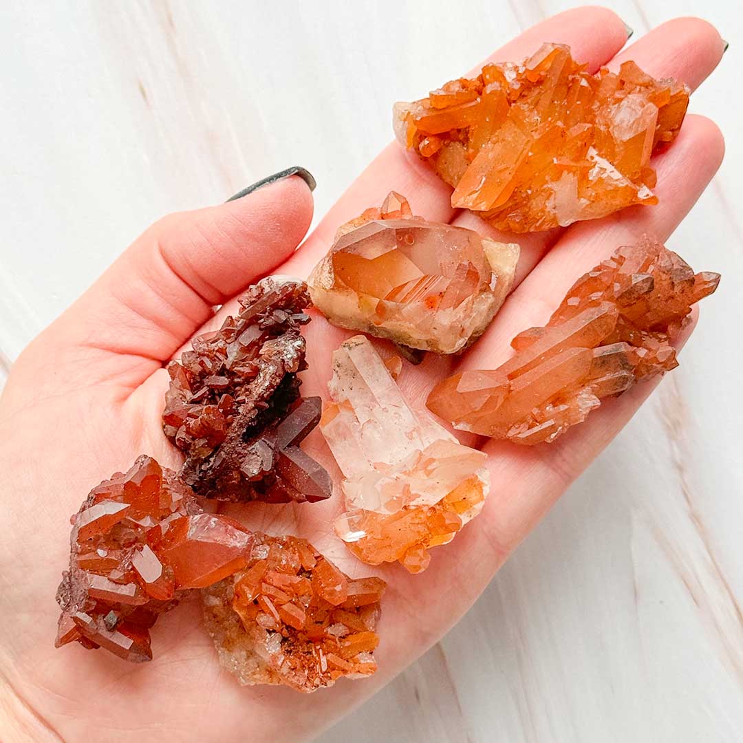 (A jelenlegiek kicsit kisebbek mint a fotózottak voltak, így akciós az ár) Narancsos színvilágú kvarc, mely Tangerin kvarc néven vált ismertté. Színét a vas-oxid zárványai vagy bevonatai adják, a vörös és a narancssárga között változik. Általában csúcsok kerülnek elő belőle, kristályos telepek ritkábban fordulnak elő. Ezek a darabok Brazíliából származnak!
