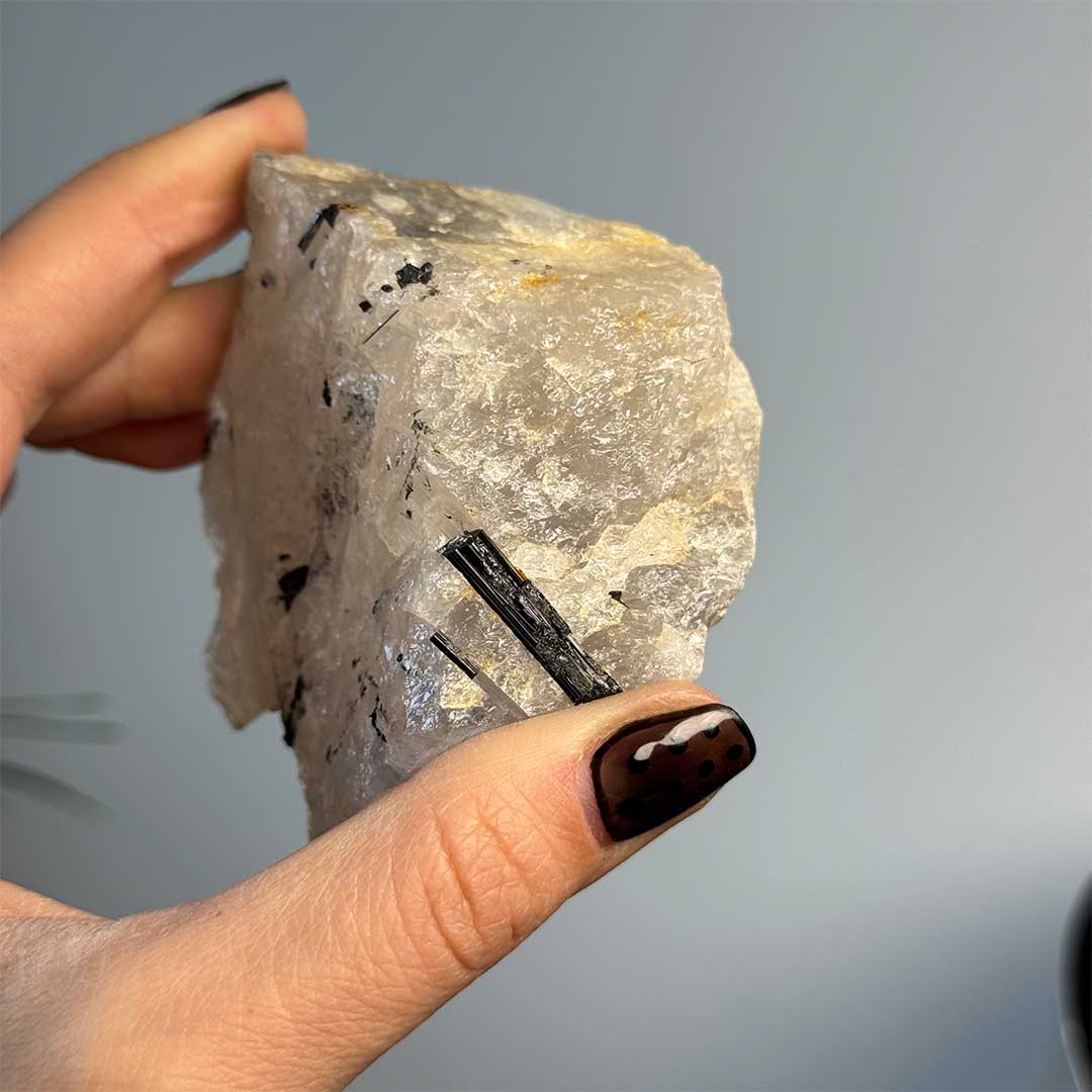 Kvarc alapba ágyazódott turmalin rögök, melyek fényesek, ébenfeketék és a turmalin jellegzetes sávozottságát hordozzák magukon. Óriás Madagaszkári Kvarc telepbe ágyazódtak, nagyon látványos egység!