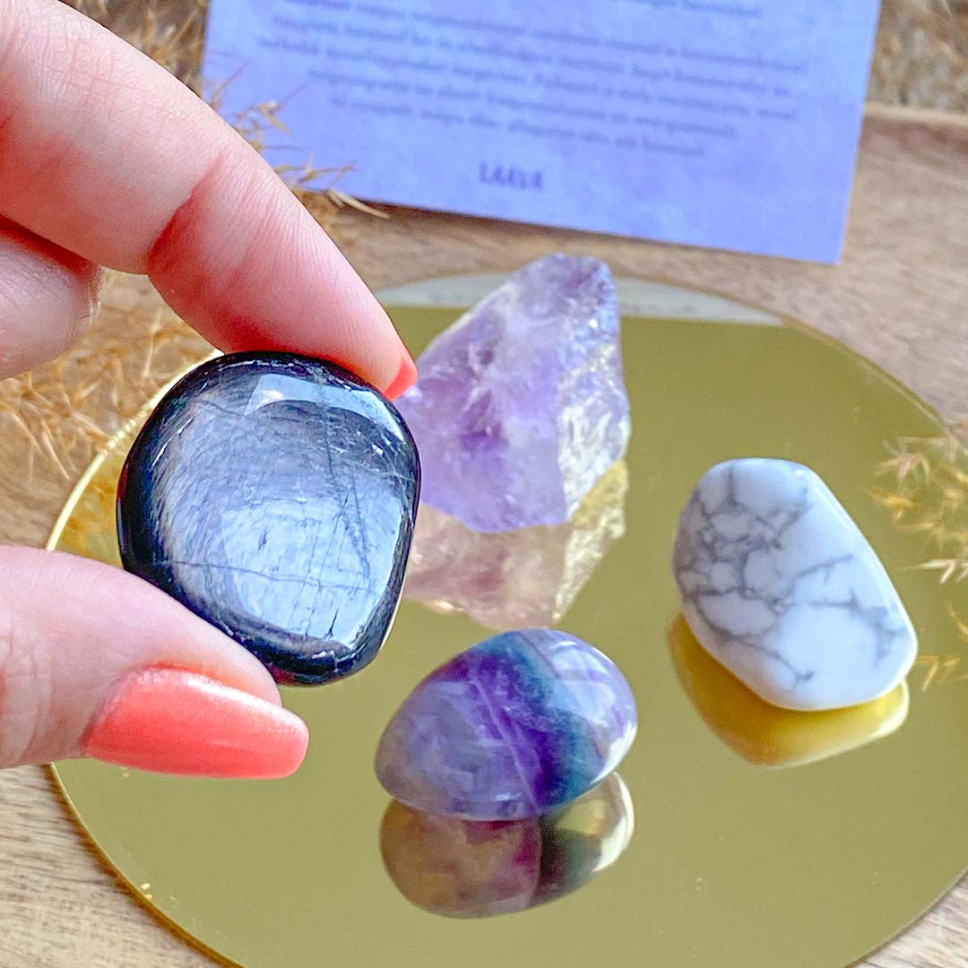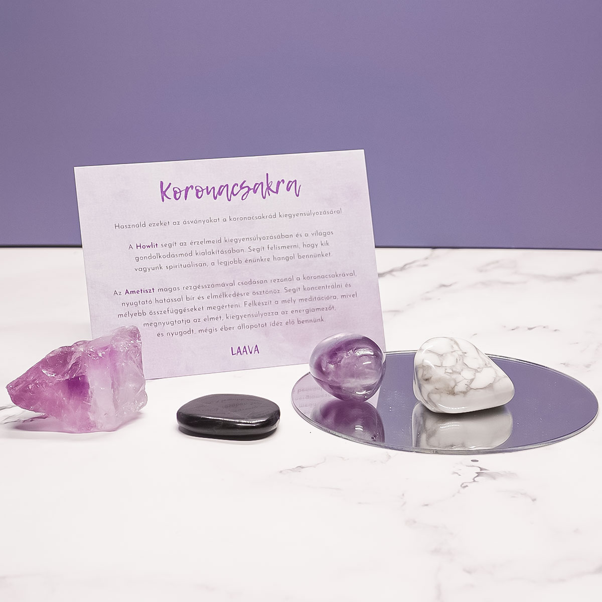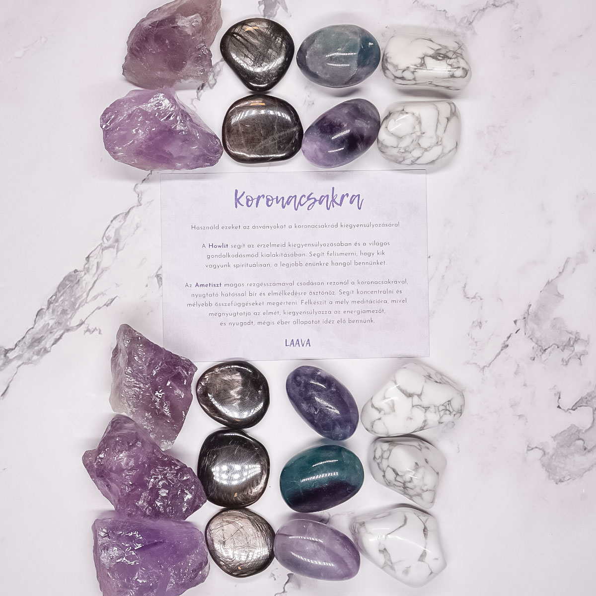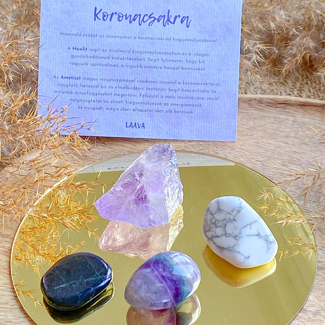 A szettben található négy ásvány segít a Koronacsakra aktiválásában, ezek a Howlit, az Ametiszt, a Hipersztén s végül a Fluorit. A szetthez adott kártyán leírjuk, mely ásvány hogyan támogatja a célzott csakra egészséges működését.