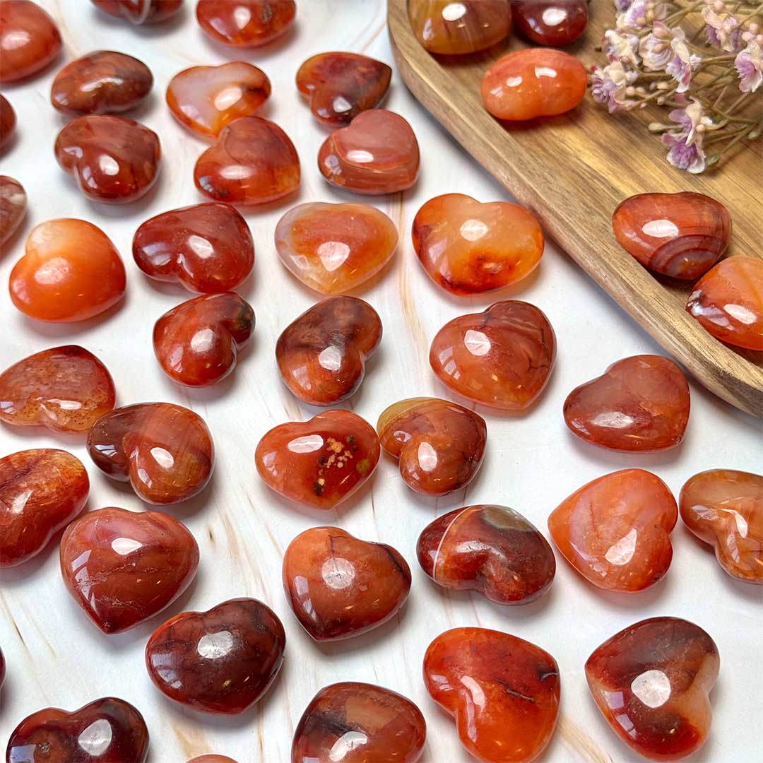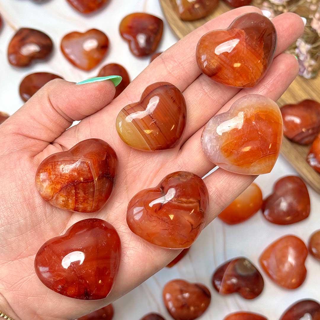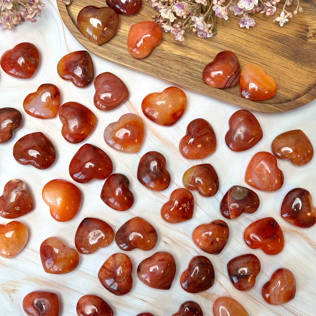 Gyönyörű, változatos mintás karneol szívek élénk színben! Minden darab kicsit más, de színeik változatosak, sárga-narancs-bordó-piros színek átmeneteit figyelhetjük meg rajtuk.