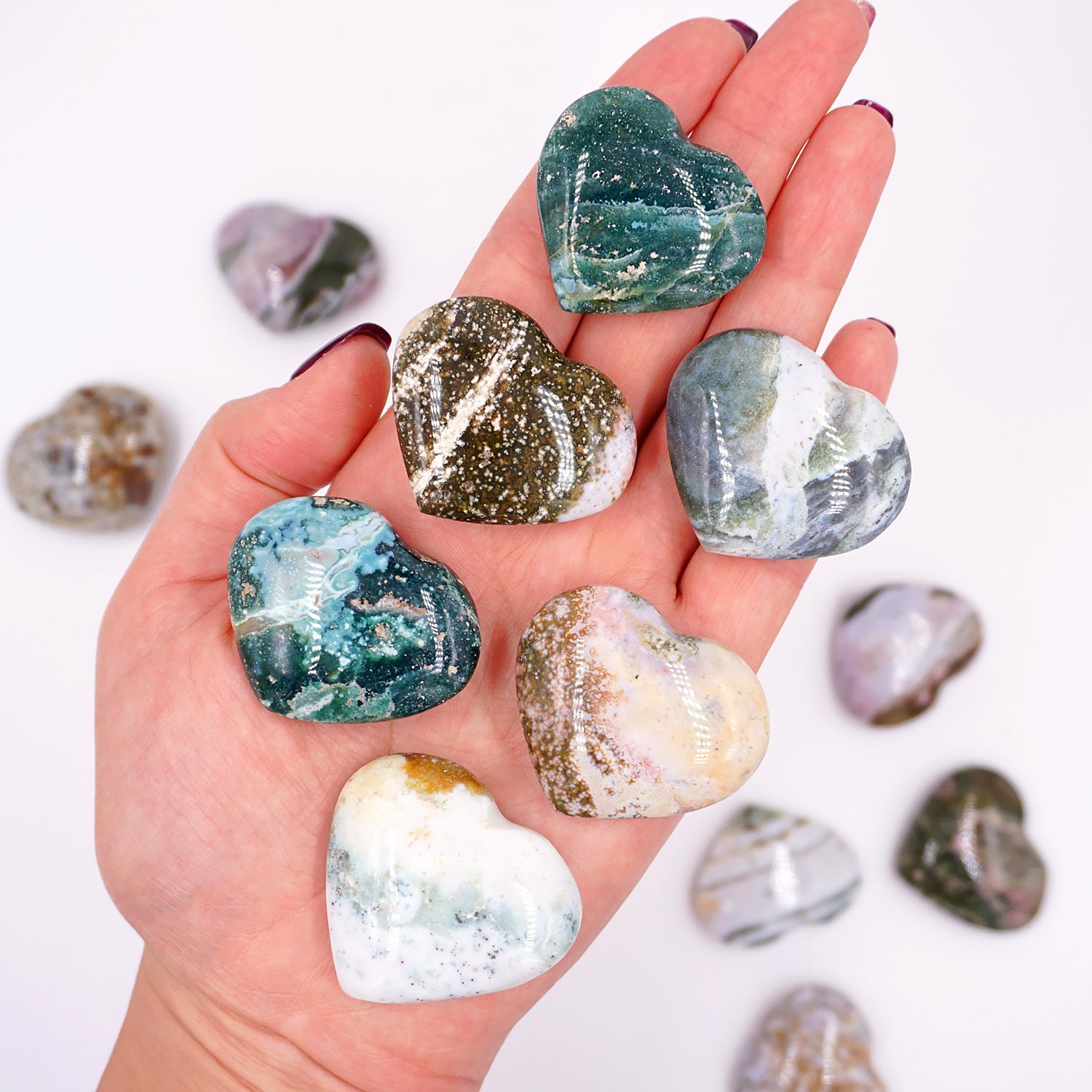 Imádnivaló és ezer színben pompázó óceán jáspis szívek Madagaszkárról, méretük kb. 3,5 cm x 3 cm.