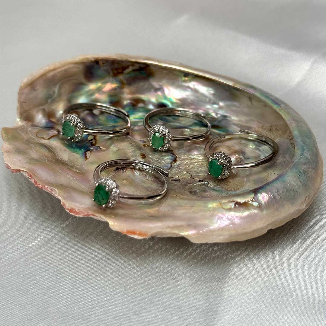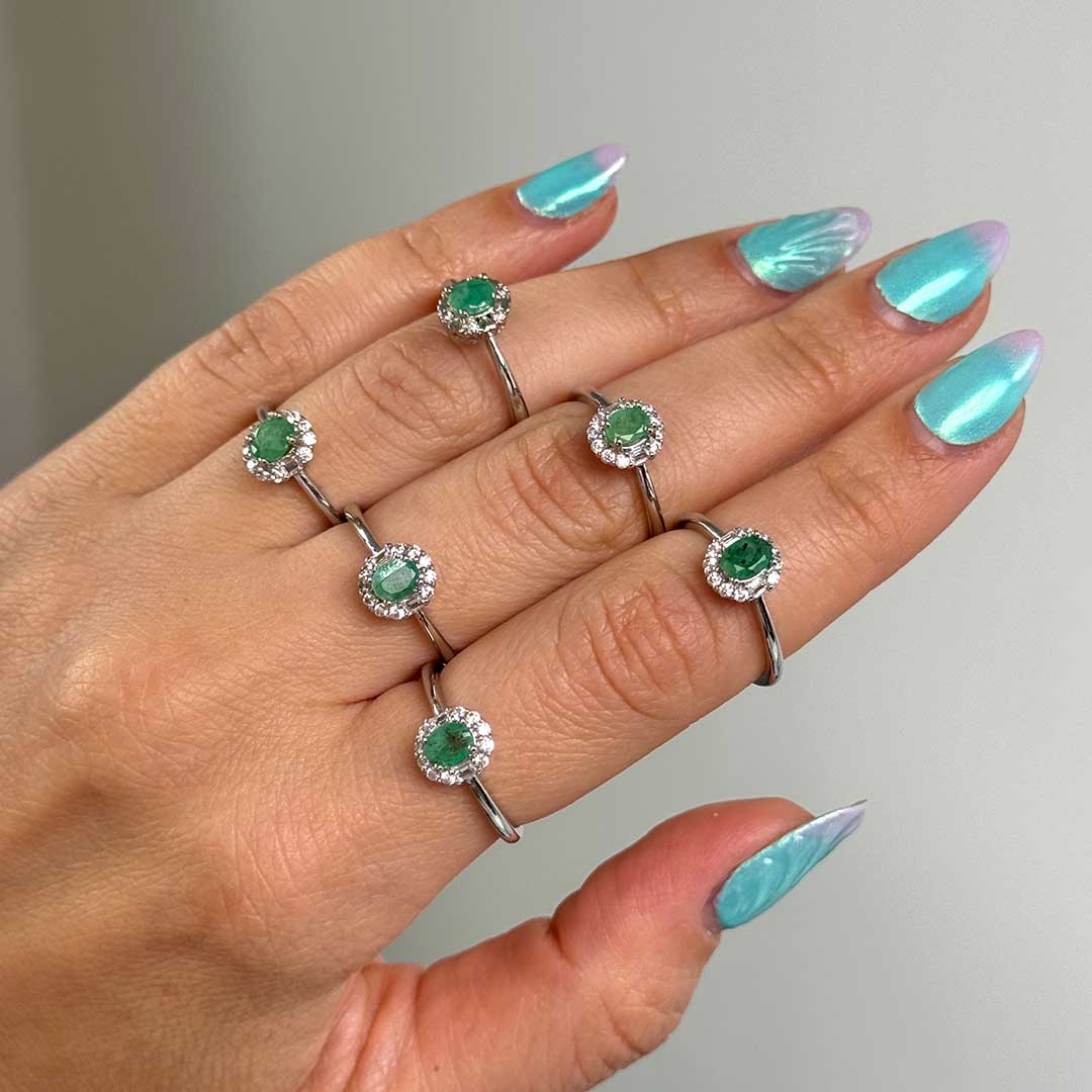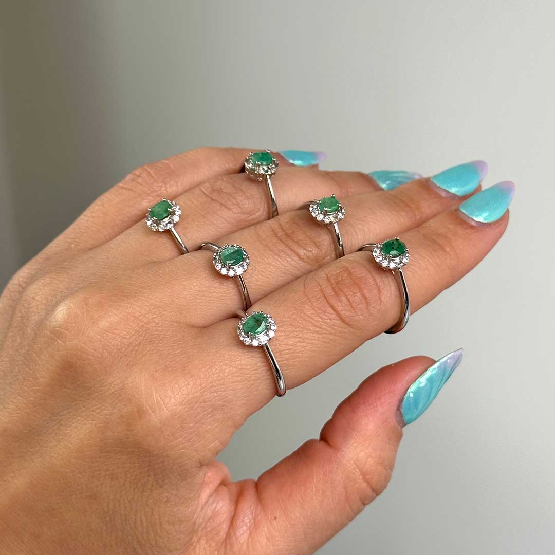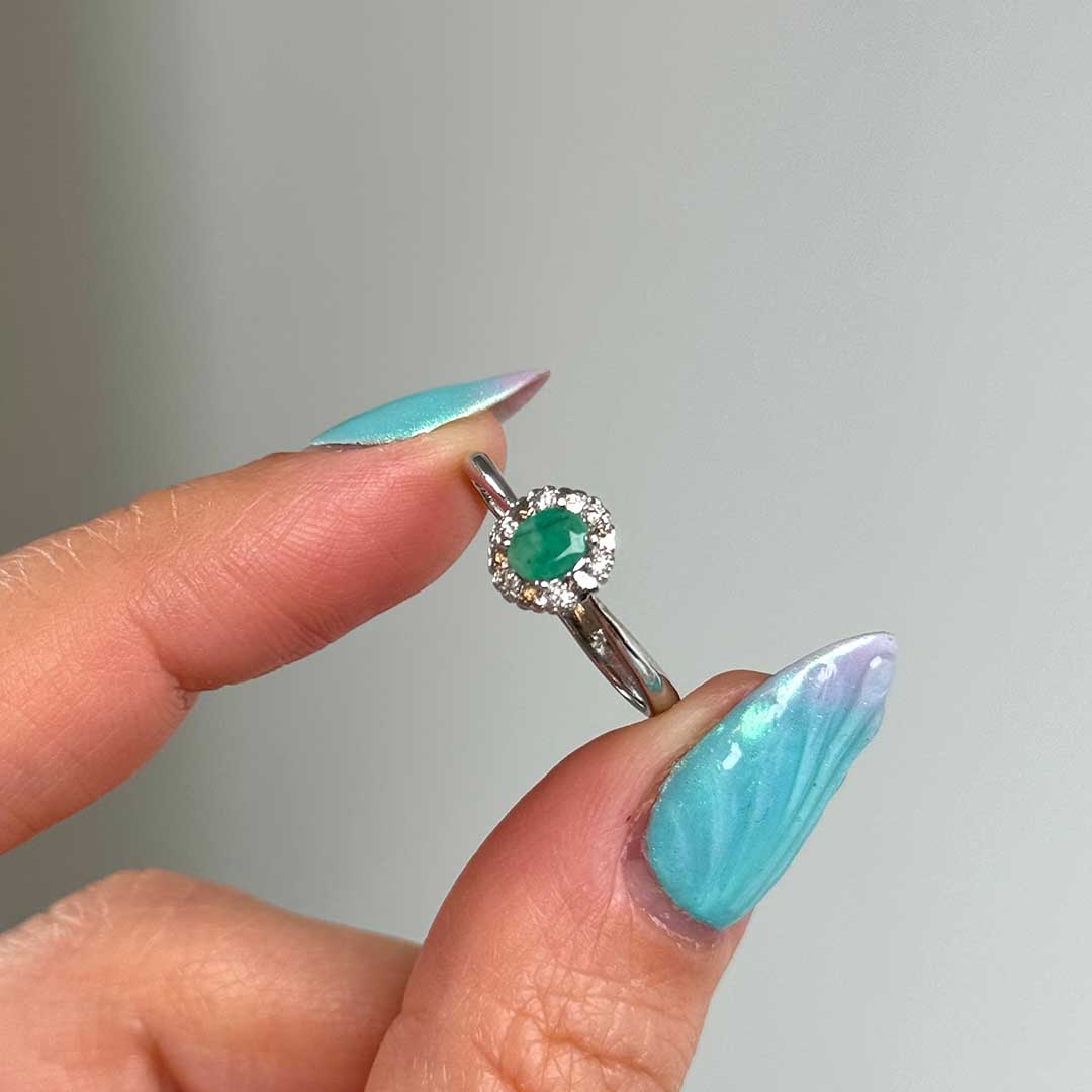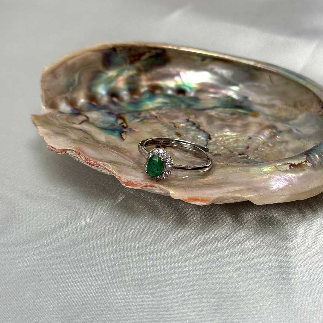 Királynői ékszer - a központi, élénk színű Smaragd kristály a gyűrű éke, mely körül apró, fehér színű cirkóniakristályok ülnek.