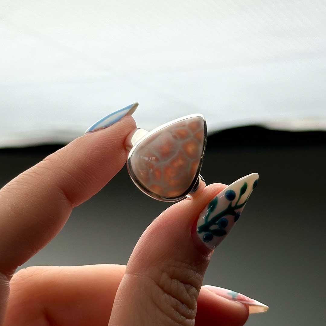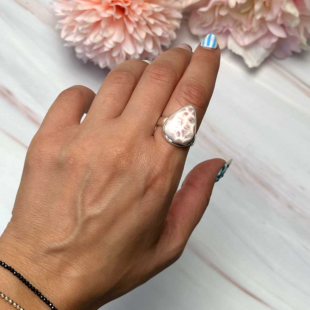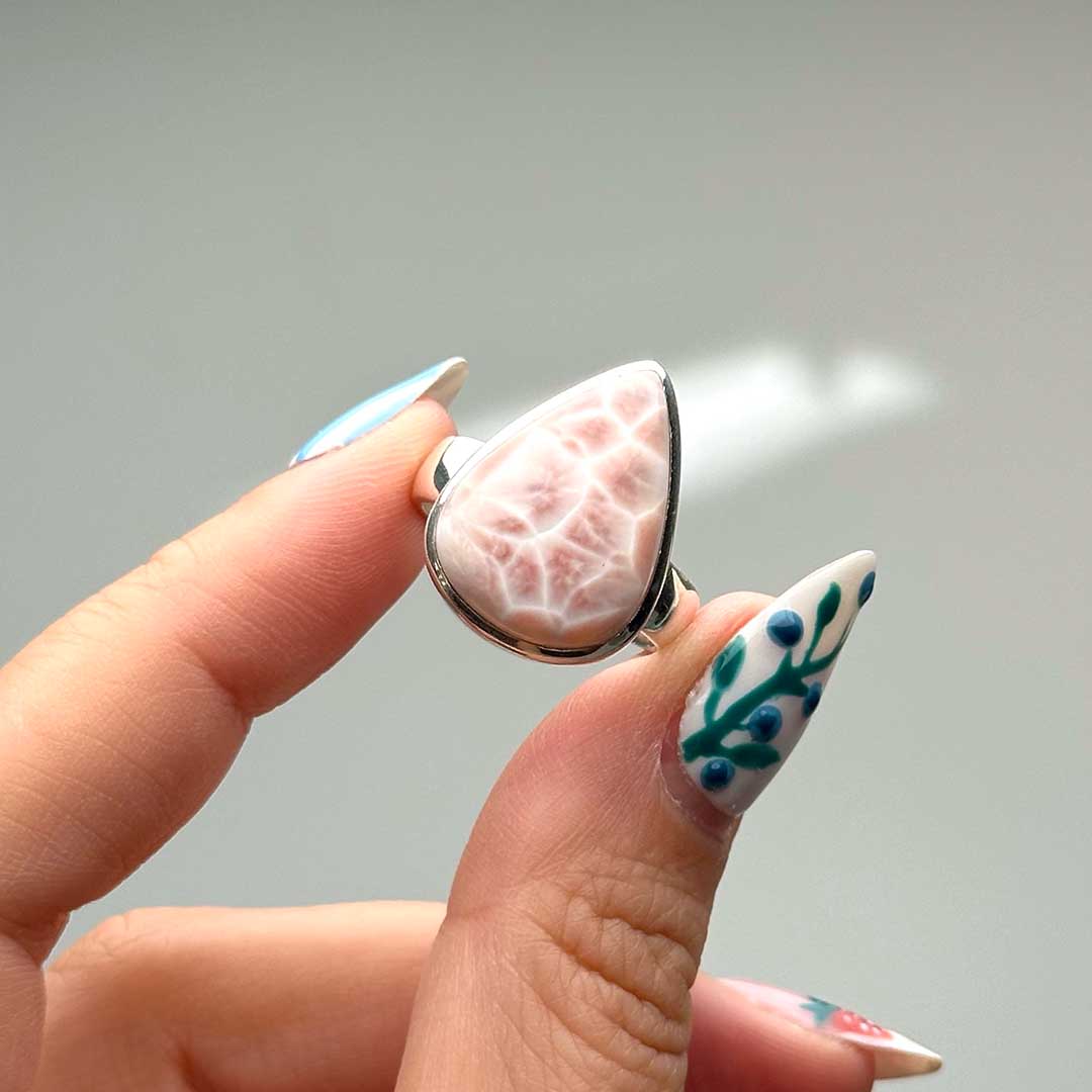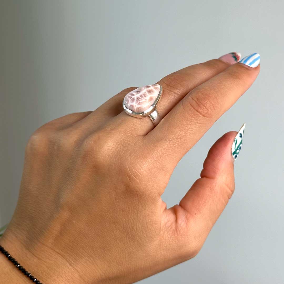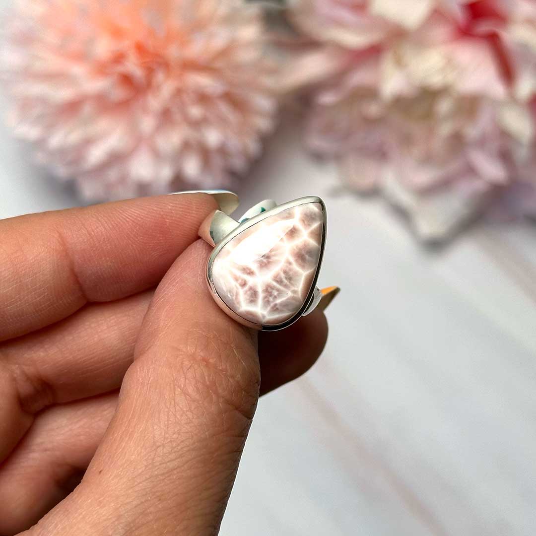 Ez a gyűrű egy ritkán látható thomsonit ásványt foglal magába, amely finom pasztelles, gyakran rózsás vagy krémfehér színével és selymes, gyöngyszerű fényével tűnik ki. Larimar-szerű megjelenése miatt a Pink Larimar nevet kapta, ugyanazt a hullámzó mintázatot, buborék-szerű megjelenést hozza, mint Dominikai párja. A thomsonit a zeolitcsoport egyik különleges tagja – természetes formában csak néhány régióban fordul elő, így ékszerben ritkán találkozhatunk vele. Szárm.: India