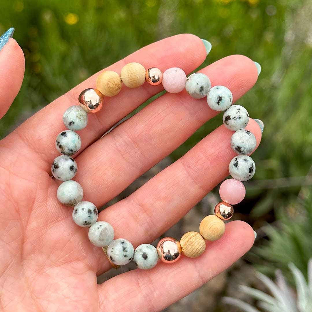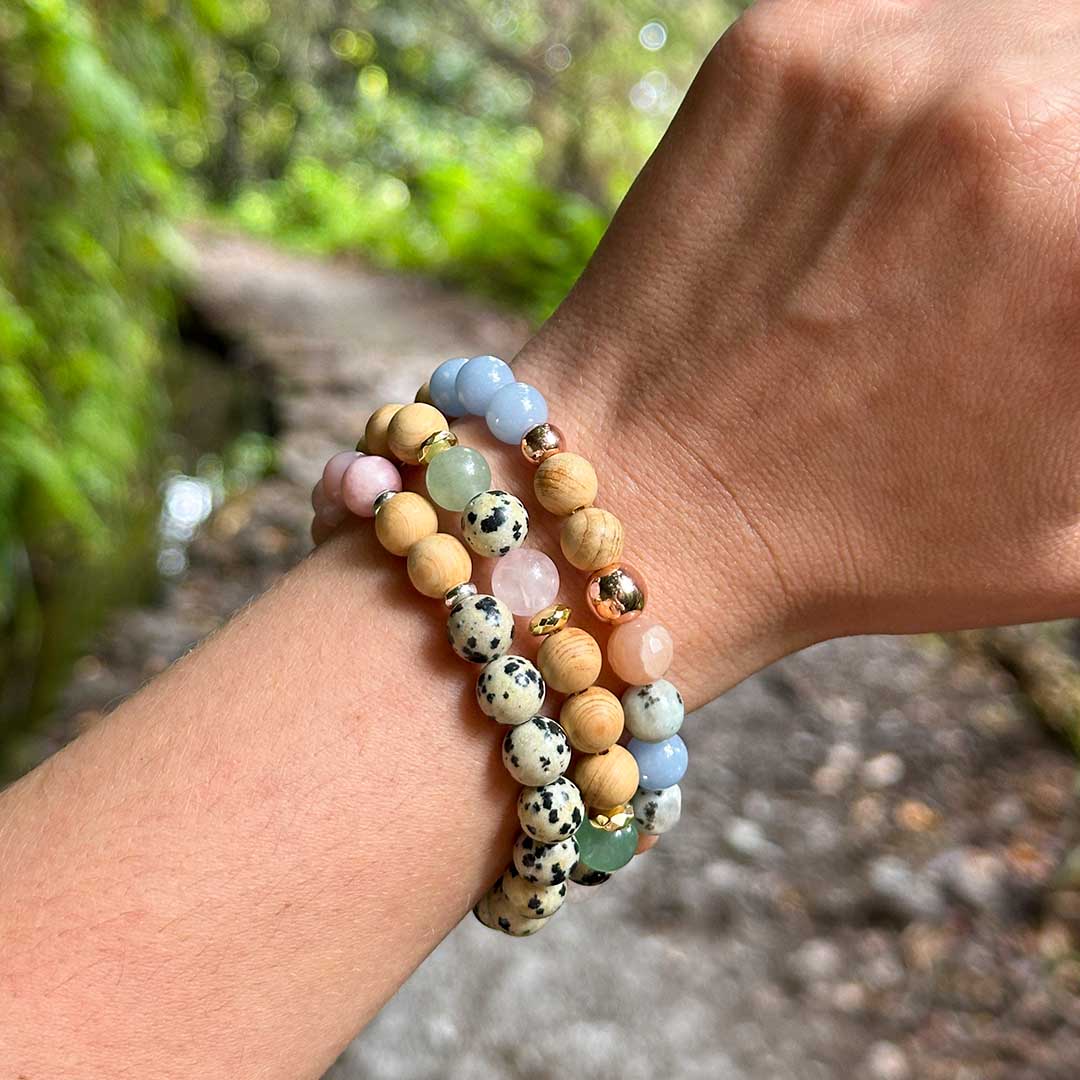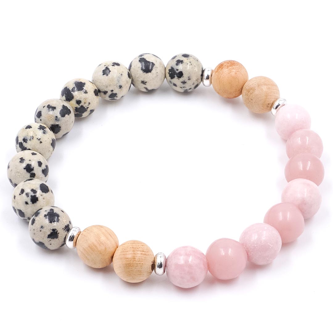 Thea – Aventurin, Dalmata jáspis, Rózsakvarc és Palo Santo karkötő