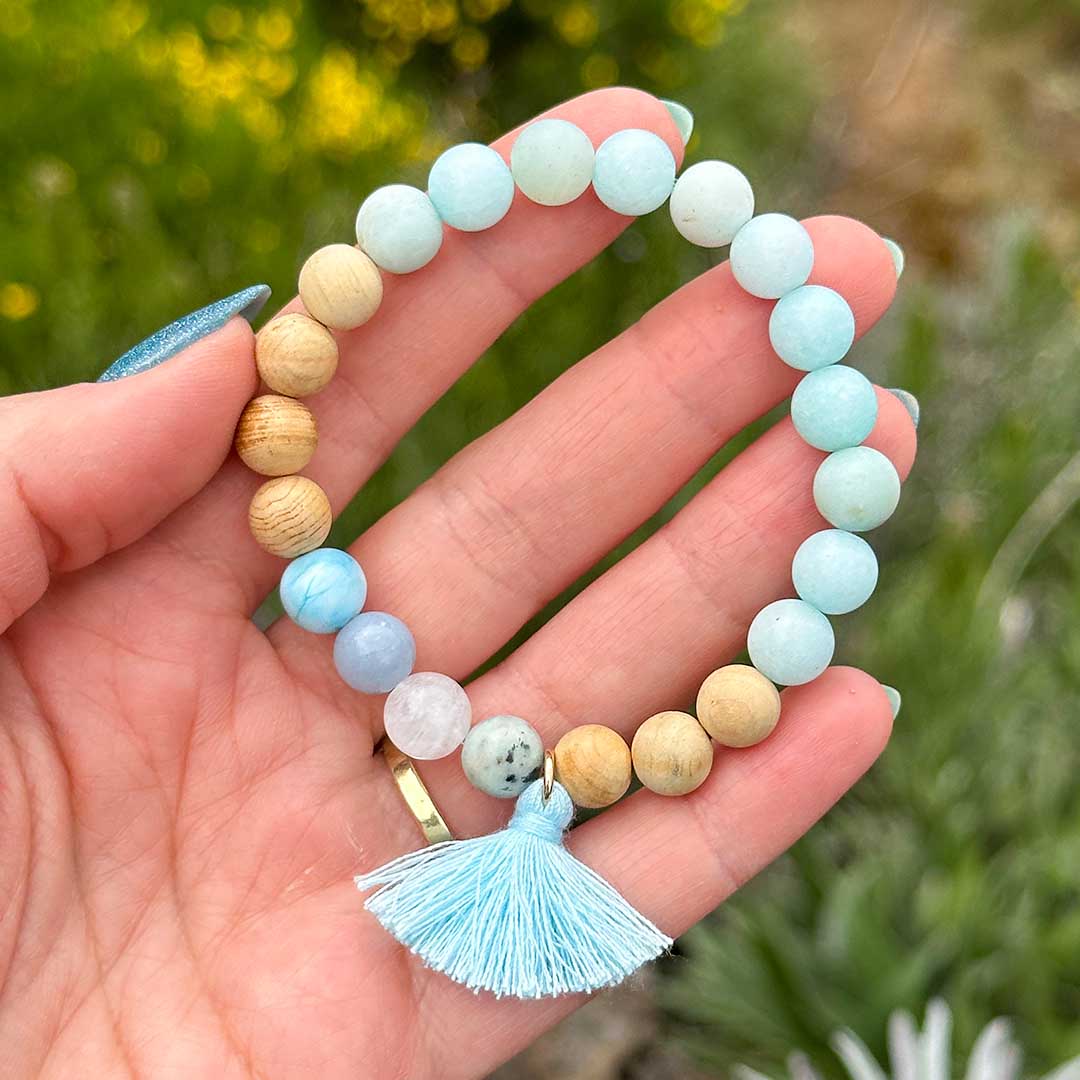 Oceane – Larimar, Angelit, Holdkő, Kiwi jáspis és Kvarcit karkötő Palo Santo fával